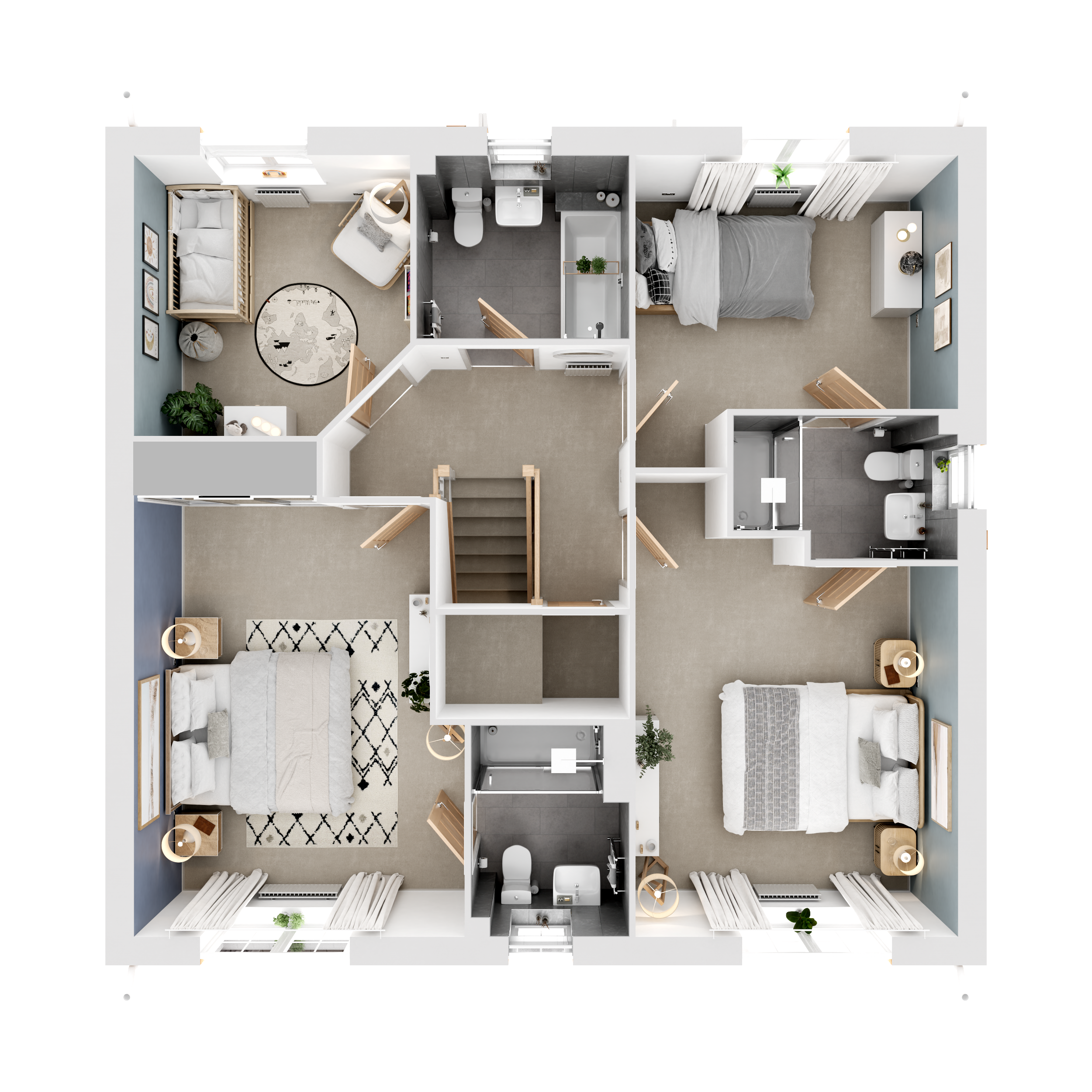 The virtual show home CGIs, videos and walkthroughs are indicative only and not an exact representation of what your new home will have included as features and finishes. Finishing Touches have been added throughout, with some of them highlighted with an ‘i’.